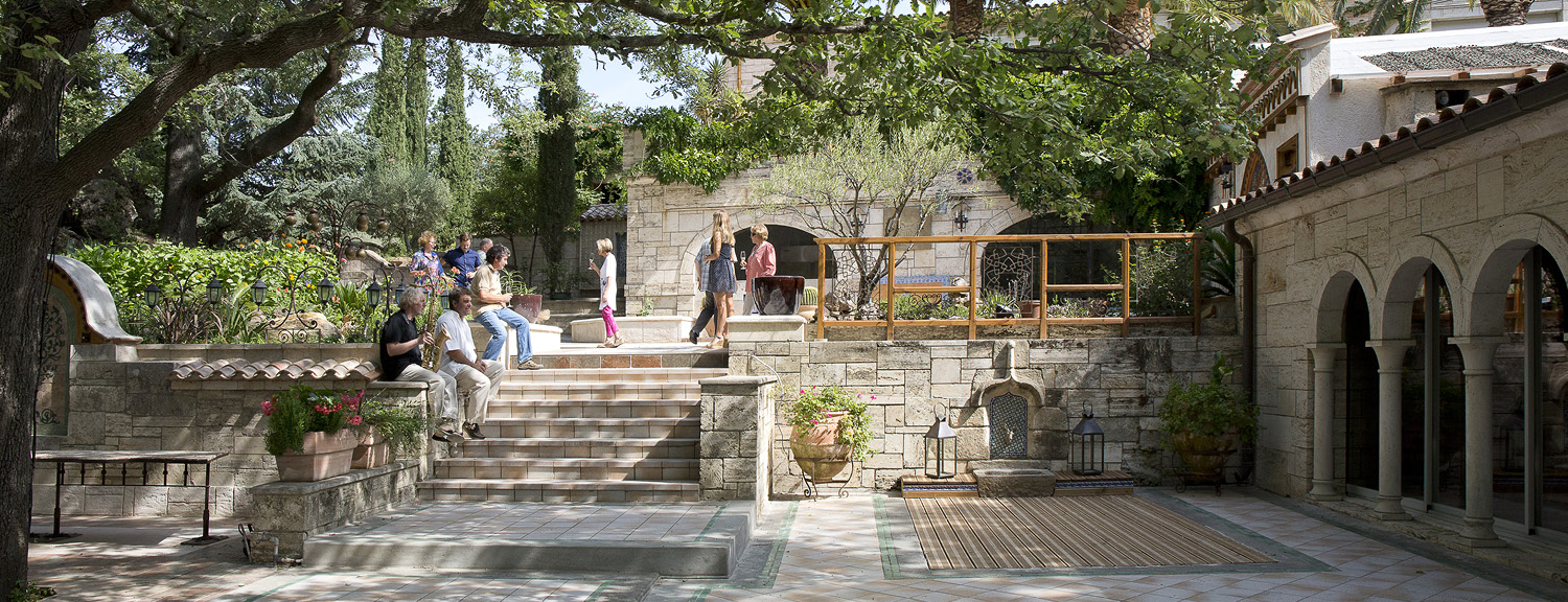 Pour un buffet à la belle saison, une animation conviviale, un repas de famille, la terrasse peut accueillir de grands groupes pour manger ou travailler en extérieur, et profiter du cadre naturel et architectural. Pour animation musicale, un orchestre trouvera naturellement sa place dans un espace dédié, près du cloître.